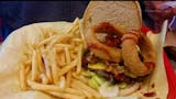 charbroiled burger w/bacon, 2 onion rings, BBQ sauce, lettuce, tomato.